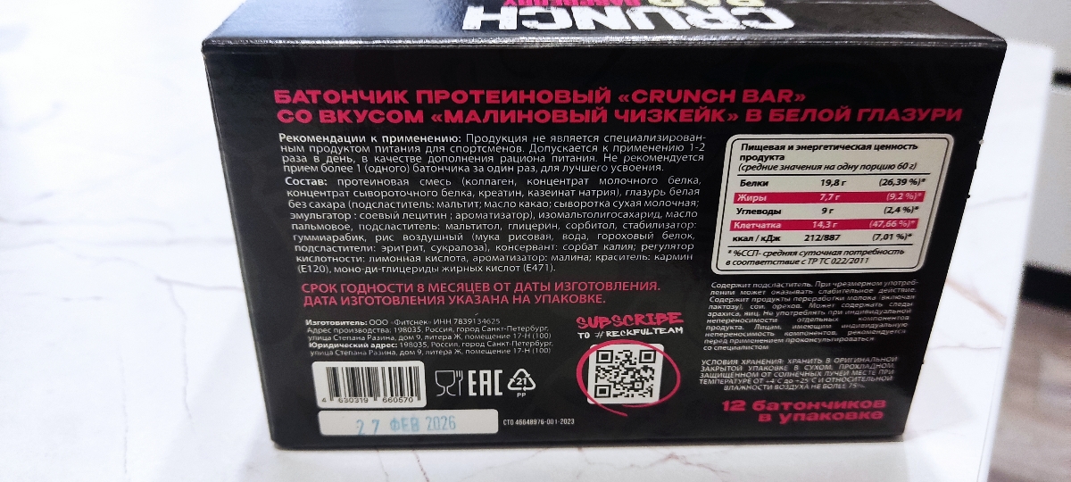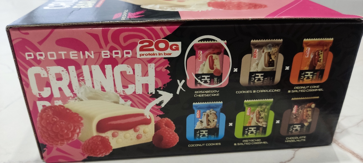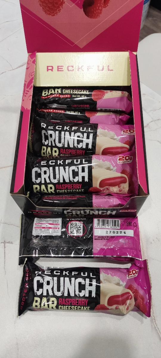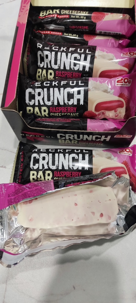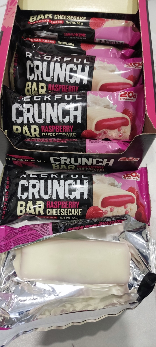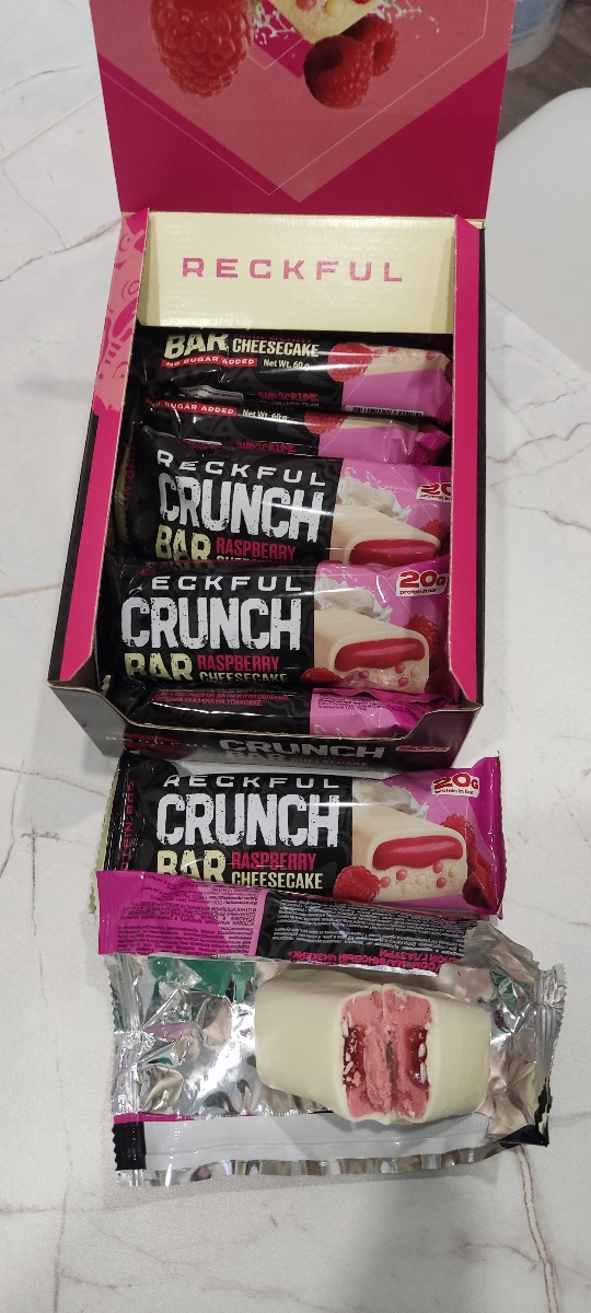 Быстрая доставка, батончики упакованы в коробку. Отличный товар от известного российского бренда Reckful который не перестает удивлять широким ассортиментом спортпита наивысшего качества - в этот раз НОВАЯ ЛИНЕЙКА протеиновых батончиков! Вкус Малиновый Чизкейк очень натуральный, не химозный, консистенция нежная, не пластилиновая, а белая шоколадная глазурь просто великолепна! Рекомендую данного продавца и товар! И привет чату!!!