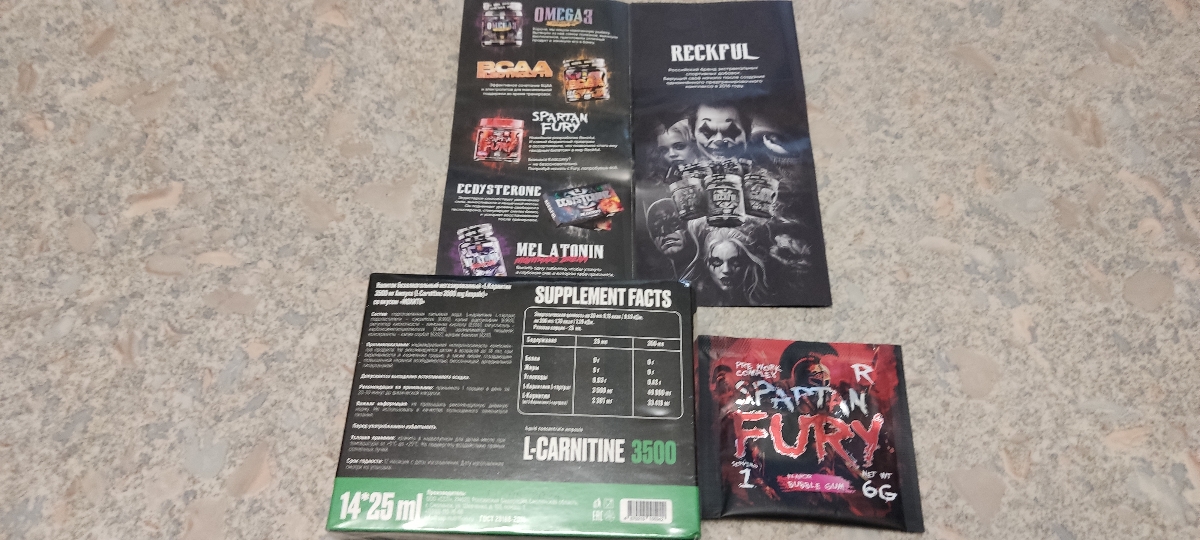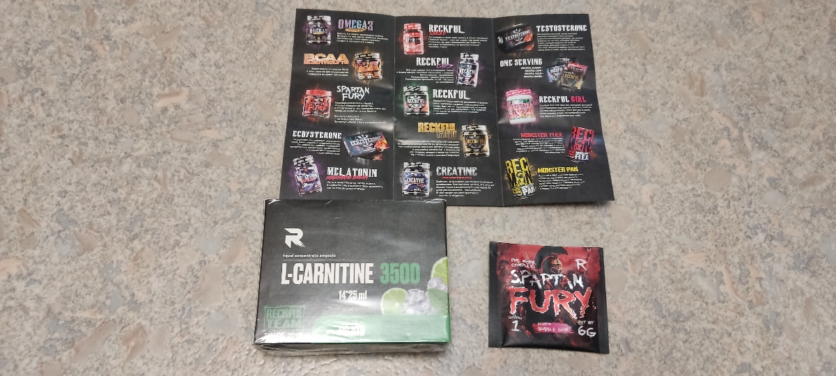 Отлично работающий L-кар от российского бренда Reckful, беру не в первый раз! В хорошей дозировке 3500 мг., в удобных шотах, пью за 30 минут до тренировки. Как и вся продукция этого брэнда, которой я перепробовал достаточное количество, L- кар также соответствует всем требованиям качества! Отлично упакован в 2 пакета, отдельное спасибо за подарок в виде пробника предтрена Fury Spartan и буклета! Всем рекомендую к покупке товары бренда Reckful!!! Илье и Володе отдельное спасибо от имени чата!)))