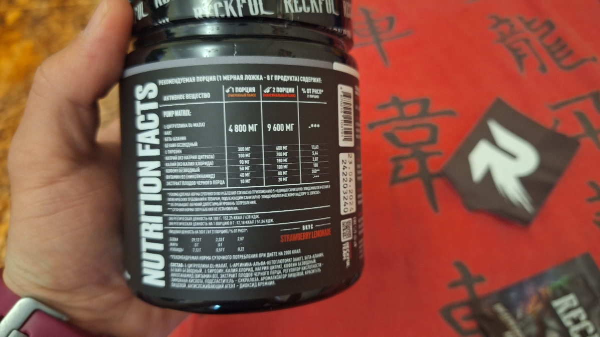Какого то ярко выраженного эффекта не ощущается(взял одну порцию, при весе 72кг), бета аланина так вообще не чувствуется(в других предтренах этой фирмы ситуация та же, но там плюсы другие) . Ужасный краситель, пластиковый шейкер из белого стал розовым. На удивление приятный вкус(я так понял это фишка фирменная). Вообщем небольшой +есть, но он очень небольшой, подойдёт тем кто только начинает пробовать предтреника.