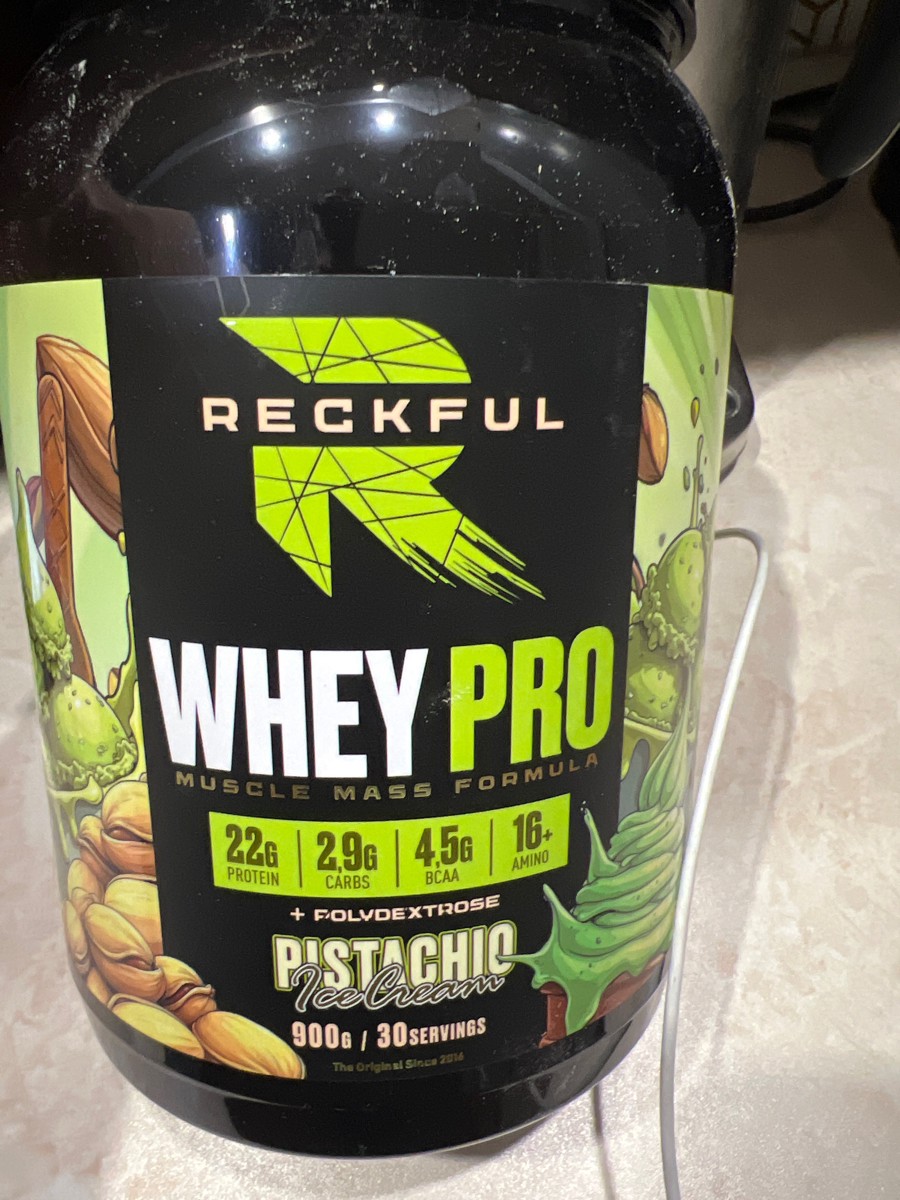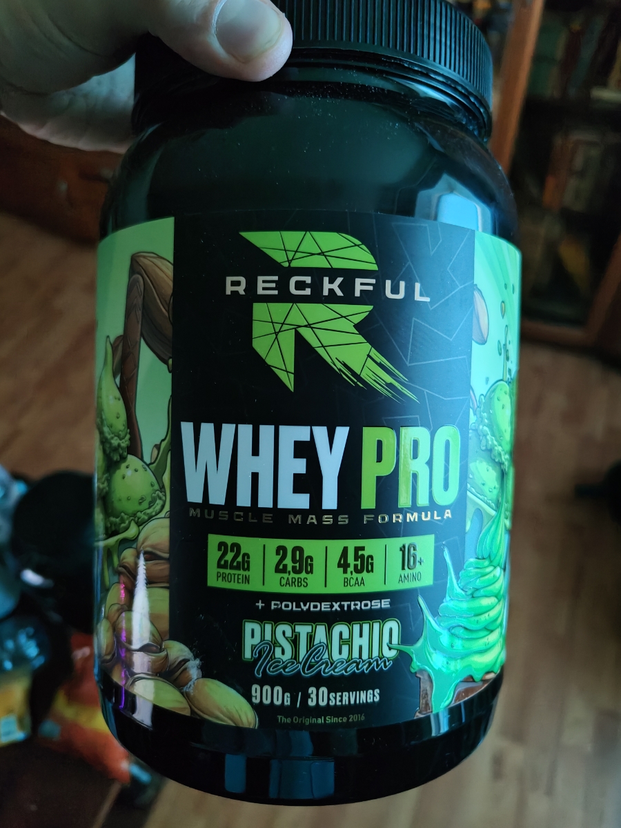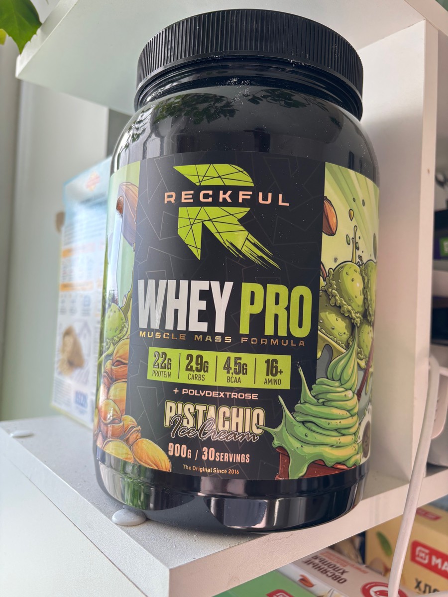 Reckful Whey Pro Protein 900 граммов со вкусом фисташка — сывороточный протеин без добавления сахара и практически не содержащий в своем составе углеводы.