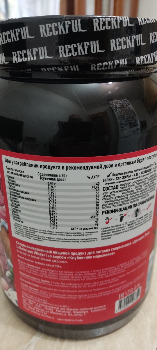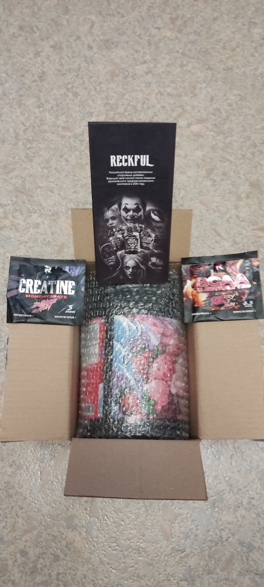 Мы так долго ждали этот протеин от Reckful и не зря - он просто бесподобен, как собственно все продукты спортпита от данного производителя! Нежный, насыщенный вкус клубничного мороженного, отличная консистенция! Оргазм для вкусовых рецепторов! До этого покупал протеин от Reckful со вкусом черники и солёной карамели они тоже очень вкусные! Разводить рекомендую на 250 мл. молока получается просто бомбический коктейль. У кого не переносимость лактозы тогда разводите с водой , но тоже очень вкусно получается! При заливке кипятком сворачивается как и положено белку! В подарок положили пробники BCAA и креатина, а также буклет! Спасибо Рикфул и привет от всего нашего чата!