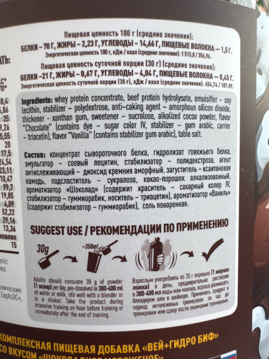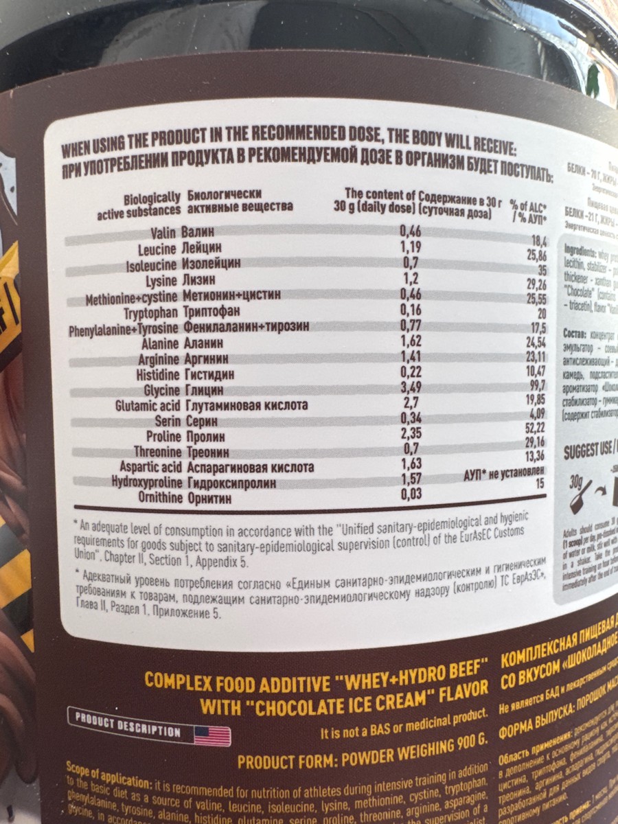 Отличный протеин с уникальным составом. Сочетание сыворотки и говяжьего протеина отлично восполняют запасы аминокислот. На вкус неожиданно но очень приятно, в меру сладко и не ощущается привкус говядины. Размешивается отлично, так что всем рекомендую попробовать !