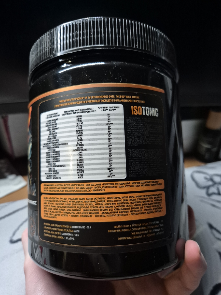пришел быстро , на удивление банка просто огромная как из под гейнера , фокус очень приятный это не те химозные лесные ягоды как в кнопках от сигарет или дешёвых энергетиках, вкус в меру сюалансированн и не приторный больше похоже на йогурт , субъективно эффект у меня наступил через 40 минут после приема могу сравнить ощущения с тем когда пробежал марафон и наконец то лег в горизонтальное положение энергии много и мышцы просто отдыхают и уже не горят , единственное что мерная ложка которая в комплекте под этим слоем порошка спряталась и я не мог ее найти поэтому рекомендую производителю приклеивать ее к фольге под крышкой , а то я думал мне ее не положили , а так хороший продукт который лично у меня не вызвал аллергии и отложения могу честно рекомендовать к приобретению