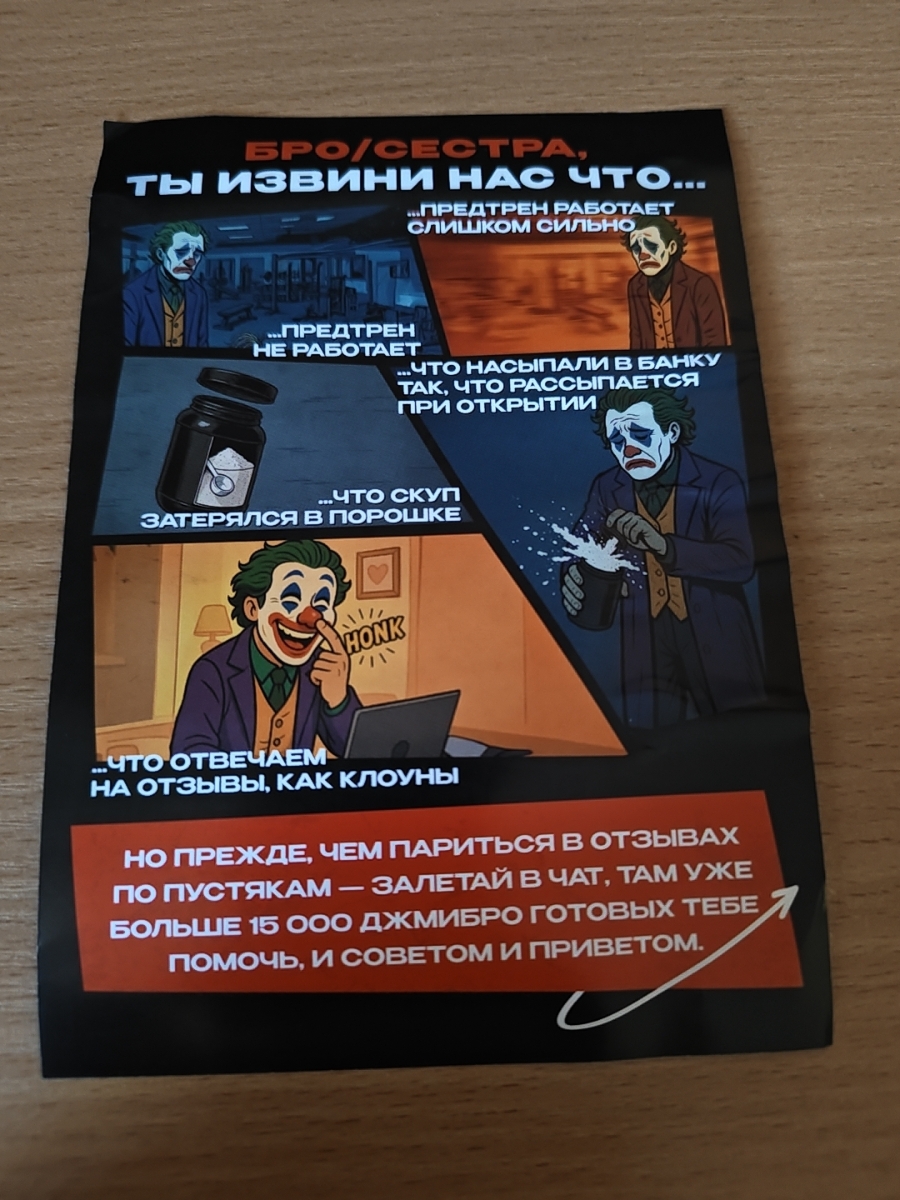 Я пробовал ранее пробную версию этого предтренировочного комплекса, она мне понравилась, и не было побочных эффектов. Ранее у меня был «Спартанец», но он закончился, и я решил взять этот продукт, так как он мощнее и лучше дает памп. Товар пришел хорошо упакован, все качественно, а бумажка с клоуном — прикольная.
