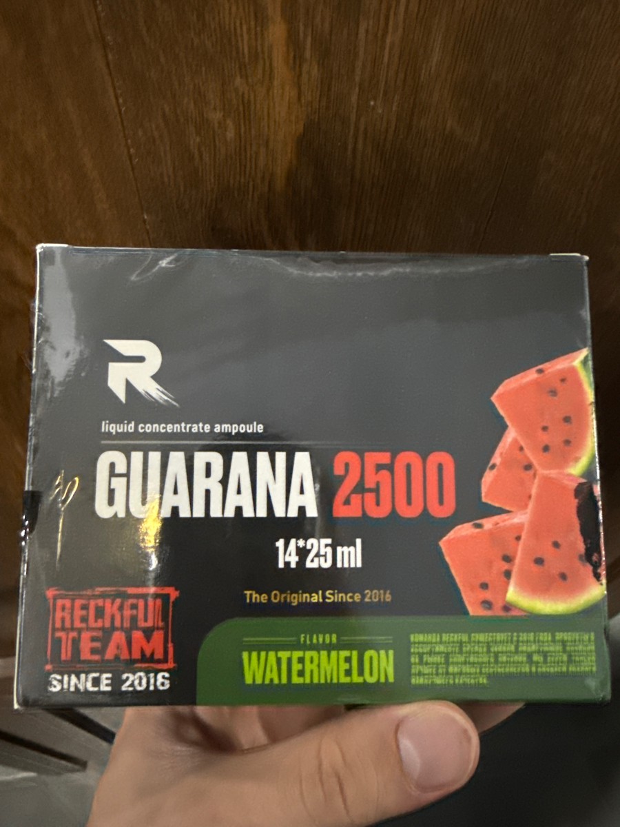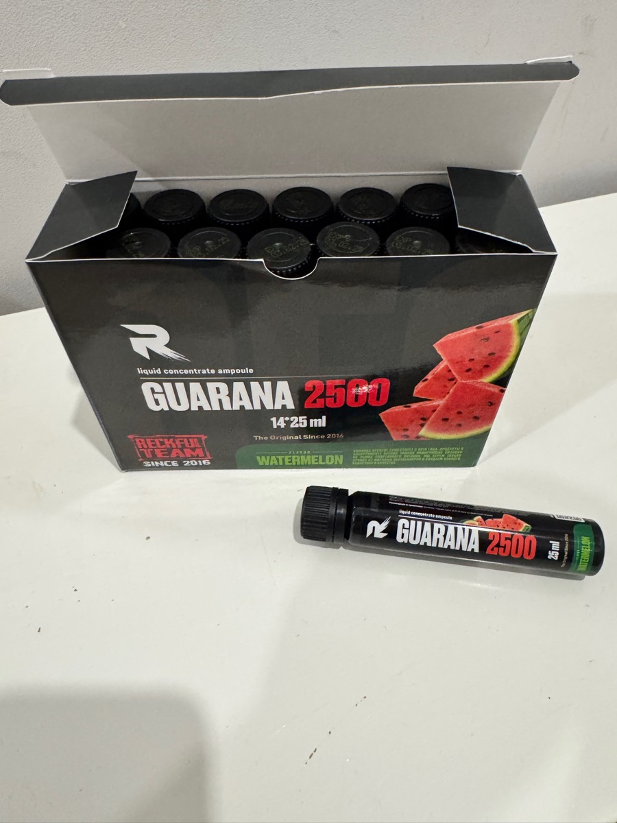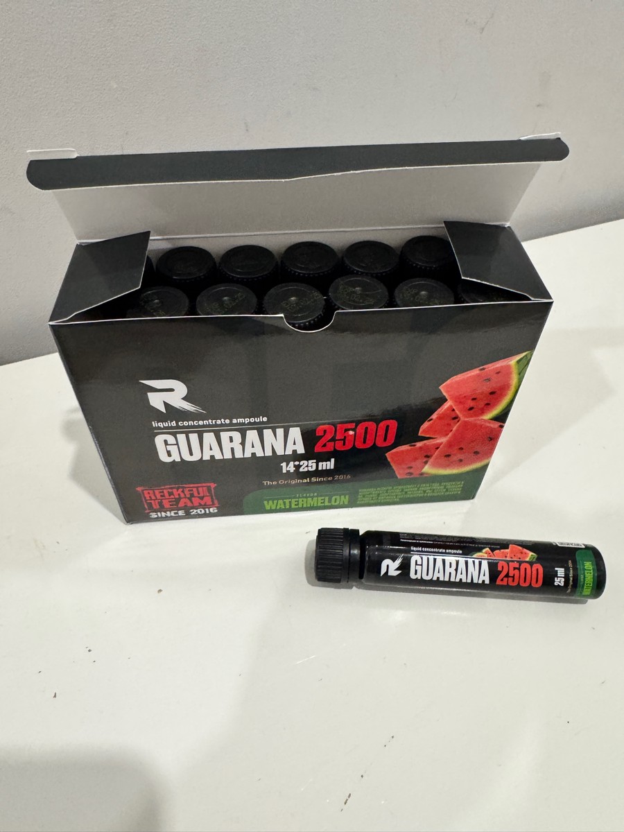 RECKFUL Guarana 2500 Liquid Ampules — ваш идеальный помощник для повышения энергии и концентрации с приятными вкусами: арбуз, ананас и вишня! Этот мощный энергетический напиток создан на основе натурального экстракта гуараны, известного своими стимулирующими свойствами. Каждая порция энергетика содержит 2500 мг экстракта гуараны. Guarana extract в связанной форме содержит активное вещество кофеин, которое способствует расщеплению жировых запасов, благодаря чему является одним из самых популярных термогеников. Ускоренное высвобождение свободных жирных кислот в кровь во время физической нагрузки сберегает запасы гликогена в мышечных клетках, повышает работоспособность и выносливость, увеличивает жиросжигательный эффект аэробных тренировок. Идеально подходит для спортсменов, студентов, геймеров и всех, кто ведет активный образ жизни. Попробуйте гуарану 2500 в жидких ампулах от Рекфул и ощутите прилив энергии, необходимый для достижения ваших целей!