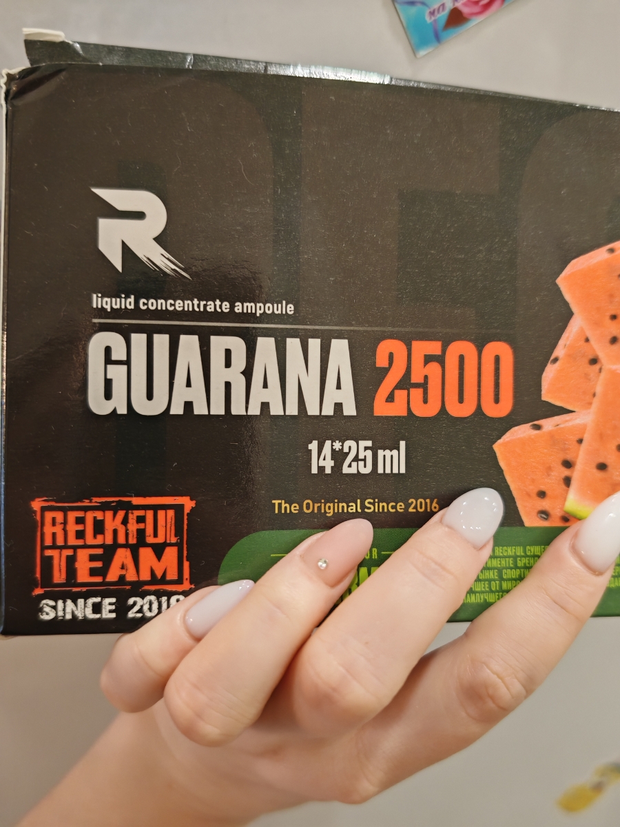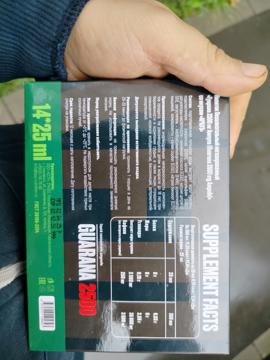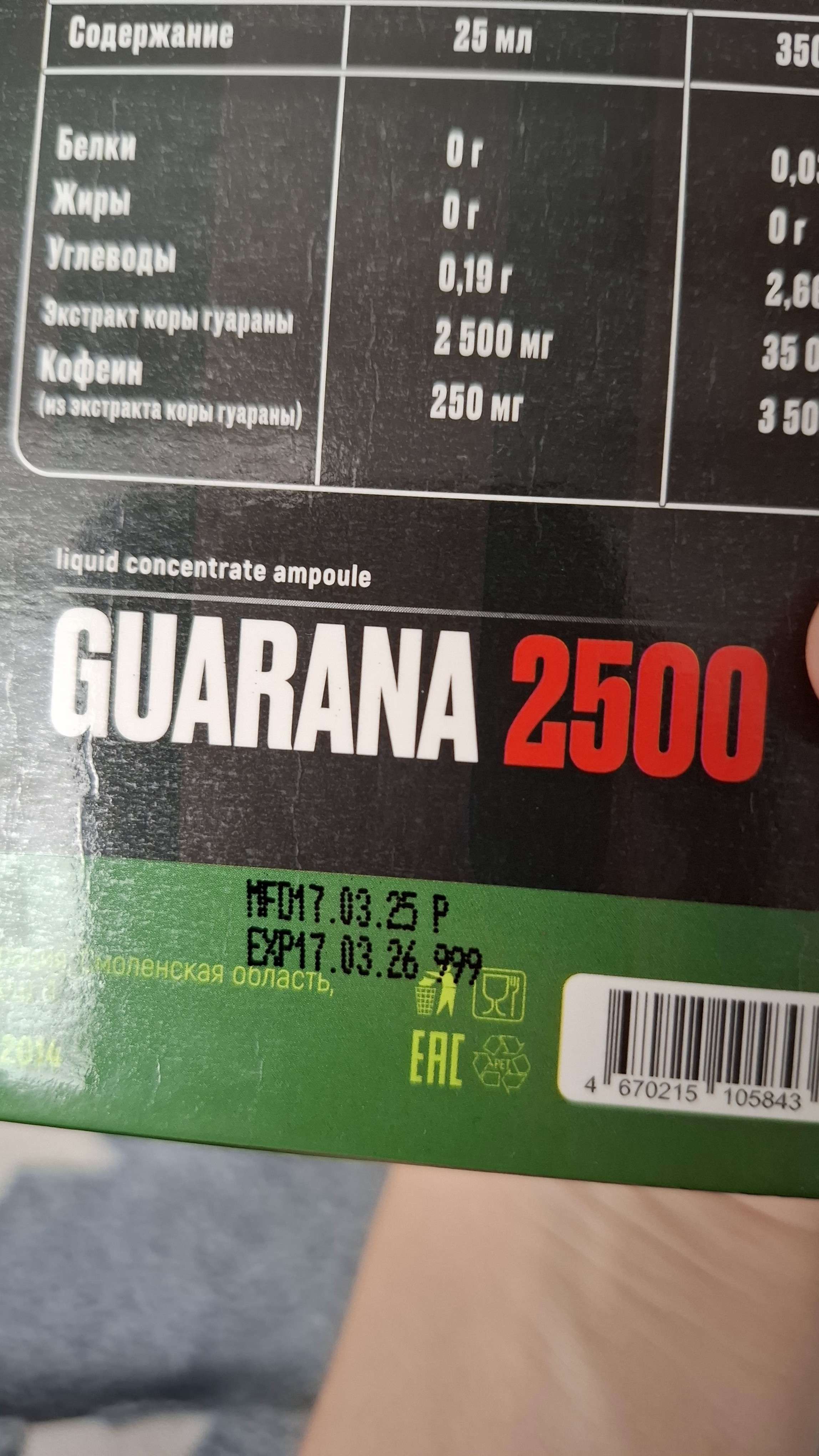 Не первый раз пользуюсь этим брендом и этой гуараной 2500. Могу сказать очень действенное средство👍🏻🤟🏻 выпил, запил водой так как мне кажется приторно. Размялся 10 минут и понеслась… часа так 2,5 каждое занятие. Чисто/подконтрольно👍🏻💪🏻 Благодарочка производителю, а также Озон за доставку👍🏻