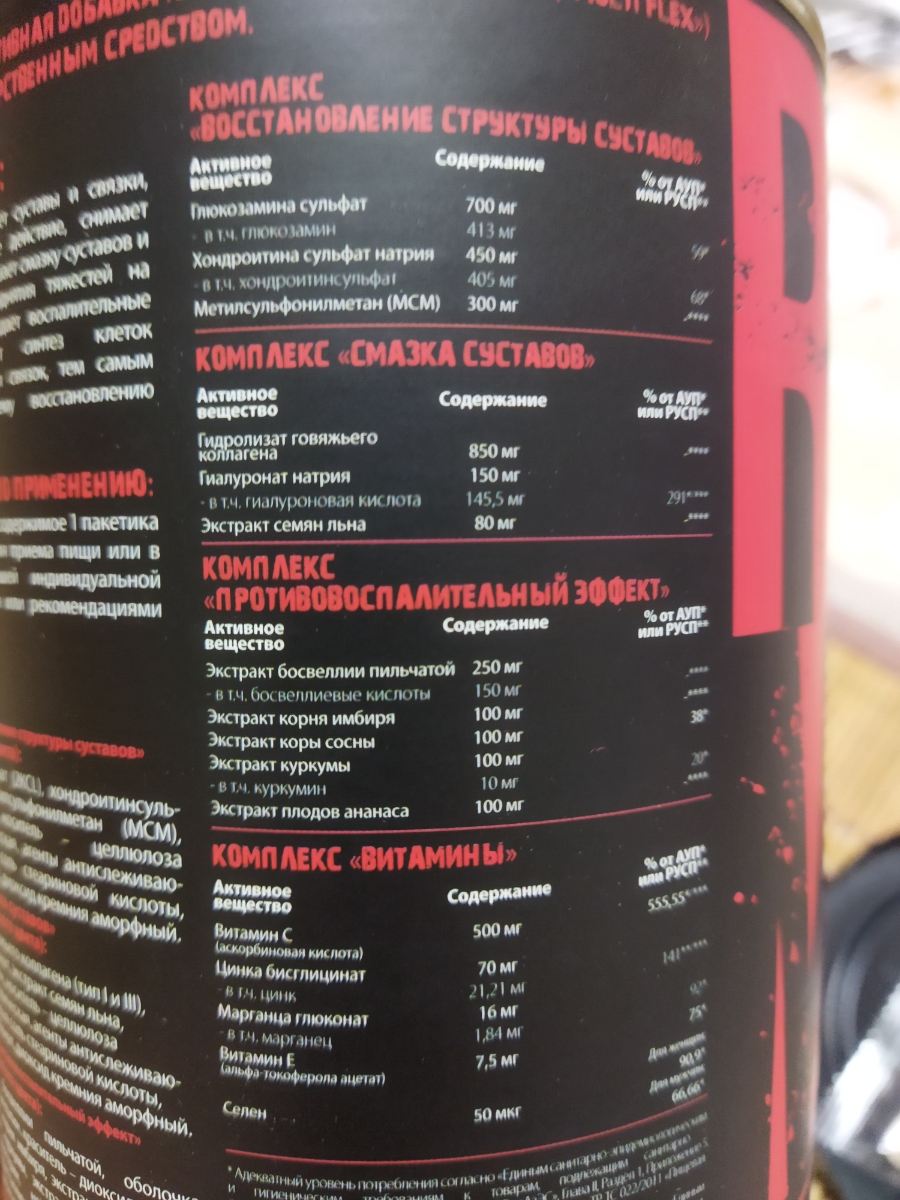 Доброго времени бытия. Сам я занимаюсь как со своим весом и с гантелями, не тяжоленькими. Больше эффект чувствуется в коленях, т.к. на одно колено есть травма. Что за травма с коленом, частичный разрыв передней крестовой связки и задней. Операцию сказали делать не будут... уже не помню причину почему не стали делать операцию, но помню отчётливо "как заклинит приходите))". Переодически в колене при выполнение упражнений, по ощущениям скрипело. После приема (чуть больше недели) данного комплекса данное ощущение скрипа в колене/коленях пропало. Даже щёлкать перестали)) удивительно. Хотя один локоть все ещё щелкает, чё ему нужно я так и не понял. Хороший и доступный БАД.