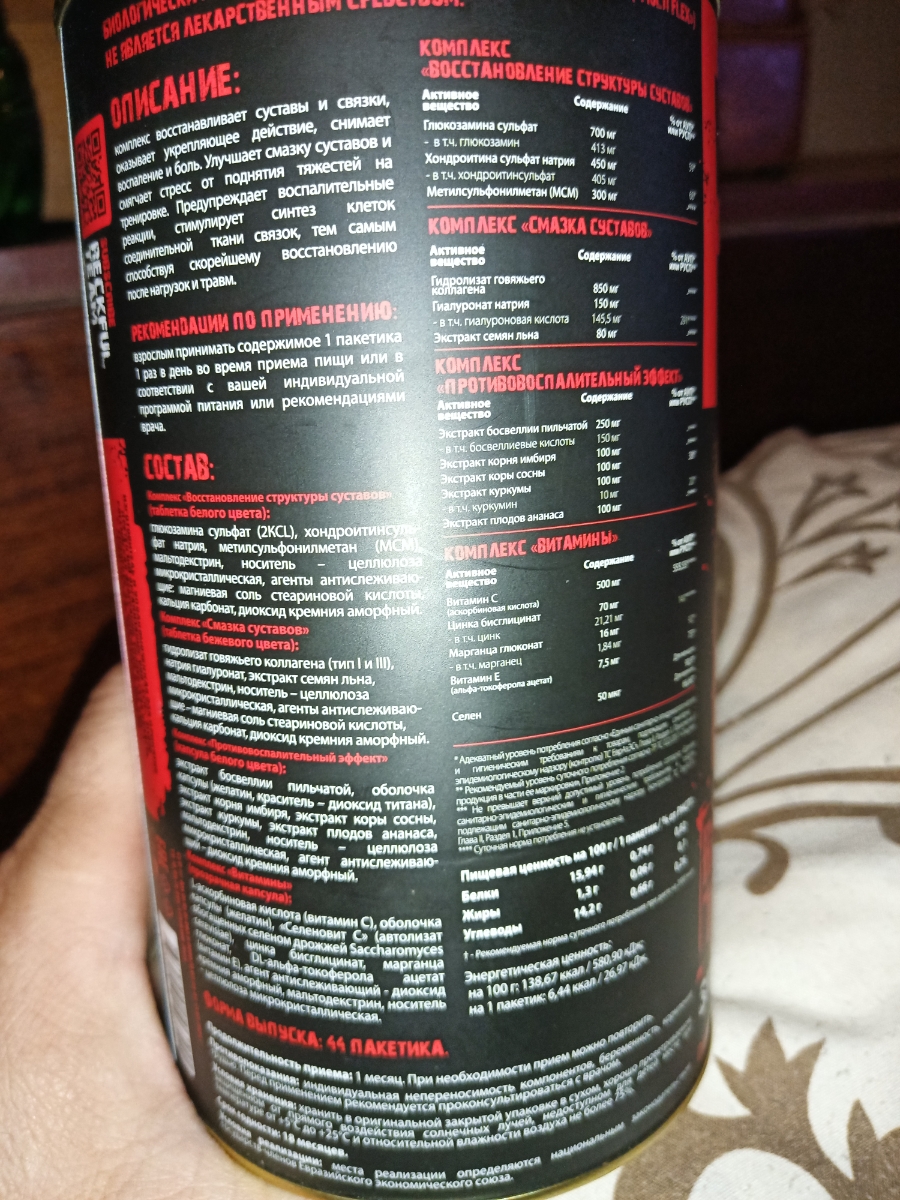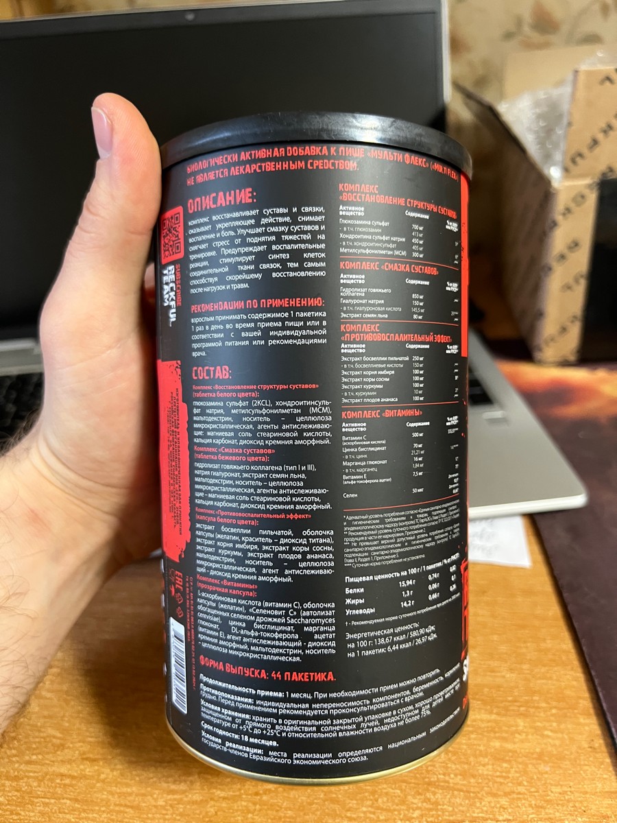 Не обратил внимание сразу, мне минус, Но... Заказывал для суставов в красной банке 44 порции. Пришло то, что на фото 30 порций и совсем другой комплекс. В любом случае я бы его не вернул, так как нахожусь на позиции...
