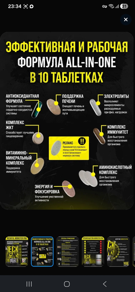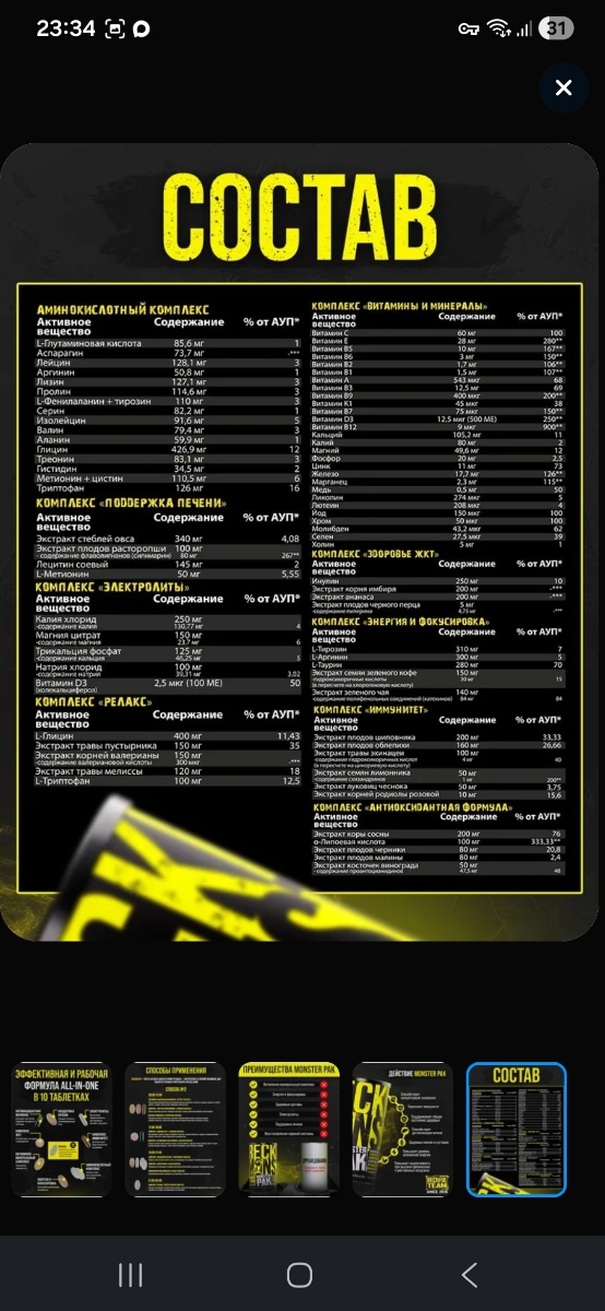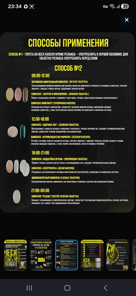По результатам 3 недель применения могу сказать следующее. В целом задумка сделать отечественный аналог легендарного уже бренда - отличная, но исполнение, как по мне, подкачало. Начну с "ложки меда". Комплекс вполне рабочий, это не пустышка, заявленные нутриенты имеют место быть, к их качеству и усвояемости вопросов нет. А теперь о том, что не понравилось и почему в таком виде от данного продукта я решил отказаться: 1. Местами спорная дозировка и комбинации нутриентов, например, дозировка цинка маловата, а Б6, которого итак у всех в достатке - наоборот, впрочем этим все комплексы витаминные страдают. Отсутствие магния в комплексе Релакс, экстракты чёрного перца и ананаса для ЖКТ (при изначальных проблемах со слизистой желудка могут ухудшить положение дел, на что тут в отзывах и жаловались) и т.д. Но это мелочи, которые можно смело простить для полноценного комплекса. 2. А вот что испортило впечатление это состав и действие "энергетической" таблетки и "релаксирующей". Лично у меня они вызвали "качели", при которых утром ловишь кофеиновый передоз (экстракты зеленого чая и кофе, ага), а на фоне принятого с вечера Релакса ходишь как огретый пыльным мешком (привет корню валерианы и пустырнику). Причем я не понял логики этих седативов, учитывая, что они на длительной дистанции вызывают привыкание, эффект слабеет и можно было тот же релакс сделать на основе магния, увеличенной дозы триптофана и, например Габы. Даже при активных тренировках такая история, на мой взгляд, не оправдана и только раздергивает нервную систему. Собственно пришлось отказаться от зеленой и красной таблеток, а тогда и смысл приобретения данного комплекса теряется. Подводя итог, ребята из Рекфул однозначно молодцы, пользуюсь их продукцией на регулярной основе (за протеиновую линейку прям респект), но тут немного недоработали, а скорее пошли стандартной спортпитовской дорожкой - накофеинься, чтоб сердце из горла выпрыгивало, а потом на седативах пытайся уснуть. Надеюсь, в итоге состав доработают и можно будет и Монстер пак брать на постоянку, а пока 4 звезды за старания и наилучшие пожелания.