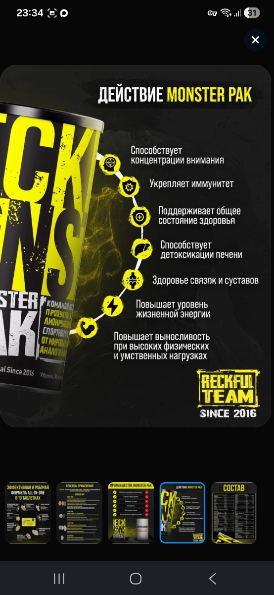 В совокупности все эти компоненты помогают улучшить общее здоровье и производительность, повышают уровень энергии, ускоряют восстановление после тренировок, укрепляют иммунную систему и обеспечивают оптимальную поддержку метаболизма. Рекфул Монстер Пак может улучшить выносливость, ускорить восстановление, увеличить мышечную массу и силу, повысить уровень энергии и улучшить общую физическую подготовку.