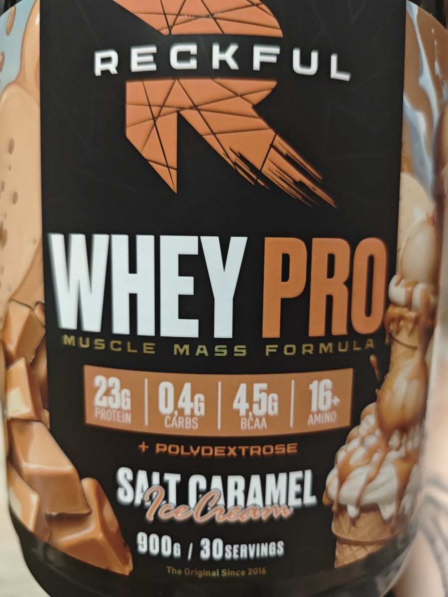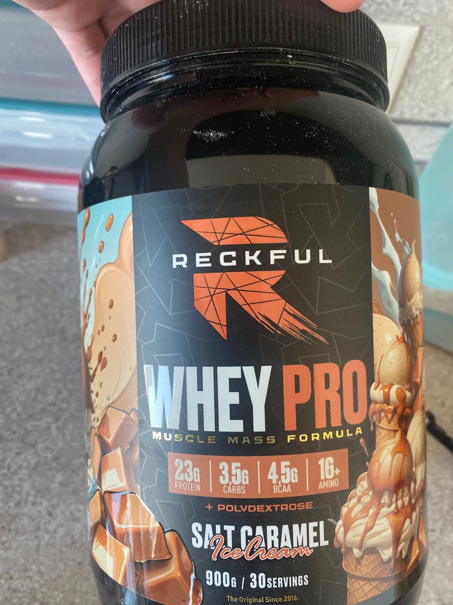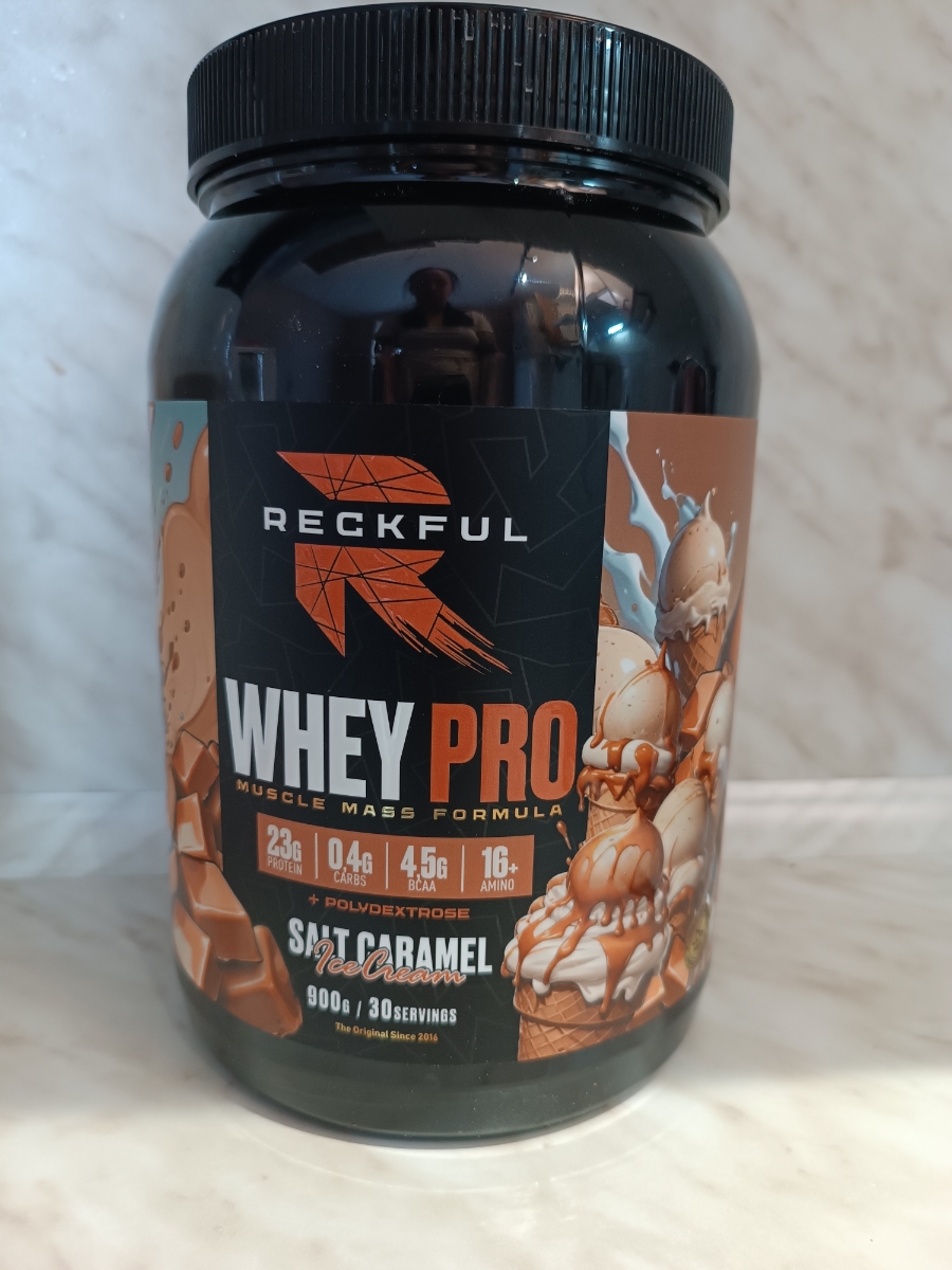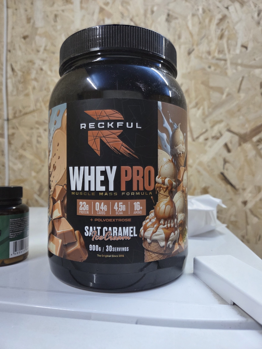 Reckful Delicious Whey Protein 900 граммов со вкусом соленая карамель — сывороточный протеин без добавления сахара и практически не содержащий в своем составе углеводы.