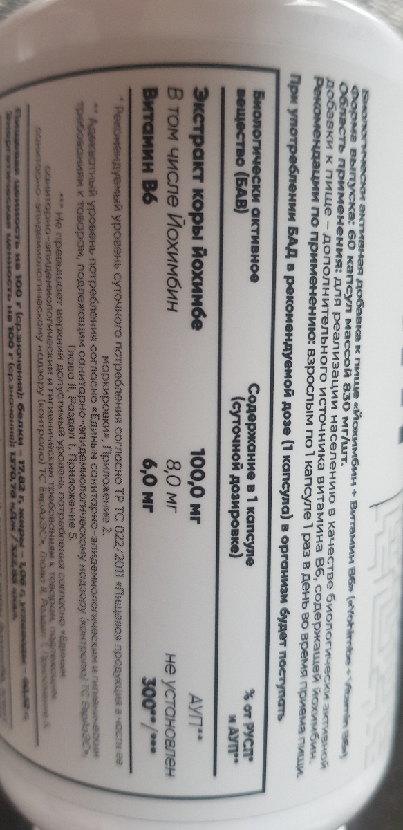 Как принимать: взрослым по 1 капсуле 1 раз в день во время еды. В 1 капсуле содержится 100мг коры йохимбе или 8мг чистого йохимбина.